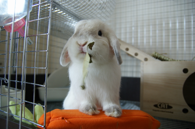 キャリー用の凍らせたペットボトルを入れるにんじんさんをケージへ。