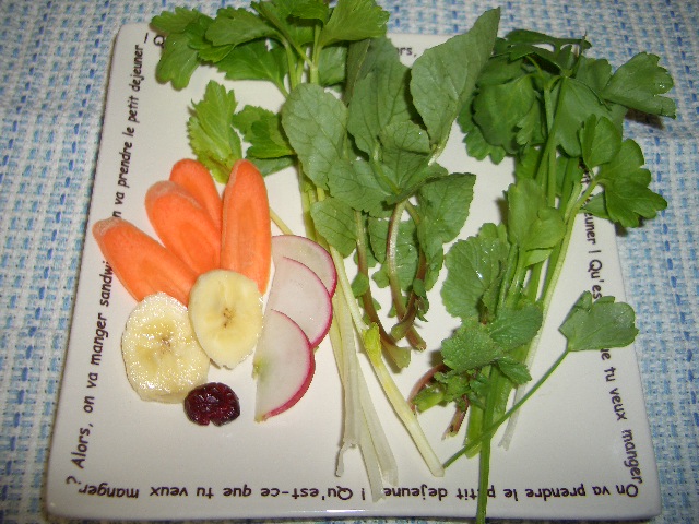 セロリ(ホワイト&グリーン)ラディッシュ(葉&実)にんじんとバナナにクランベリー。