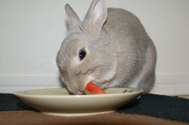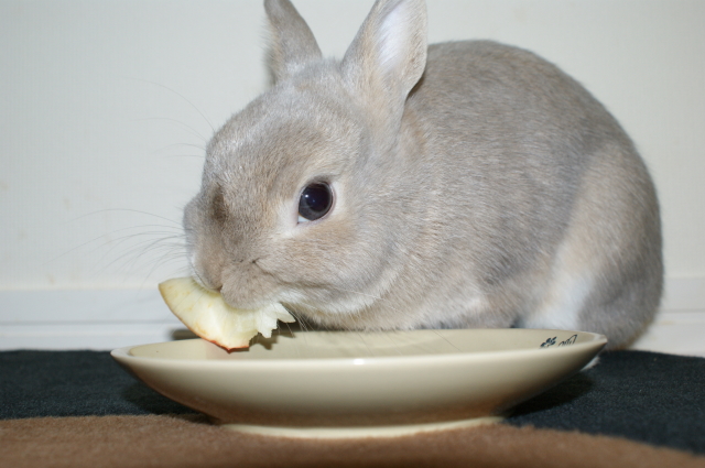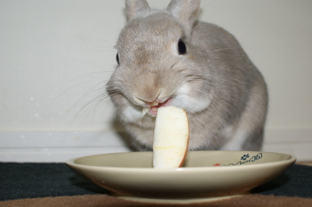 うさまっしぐら、真剣なお顔でリンゴにかぶりつきます。