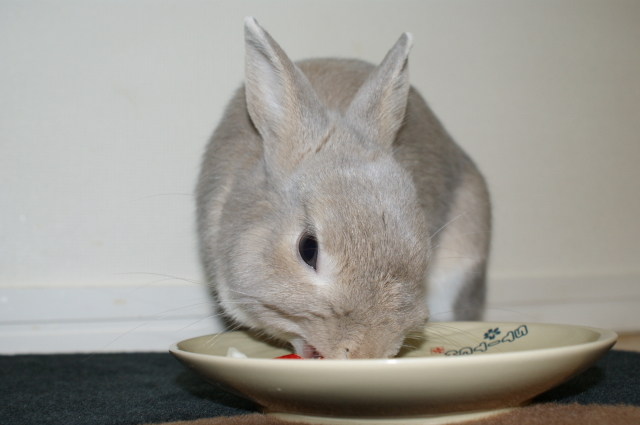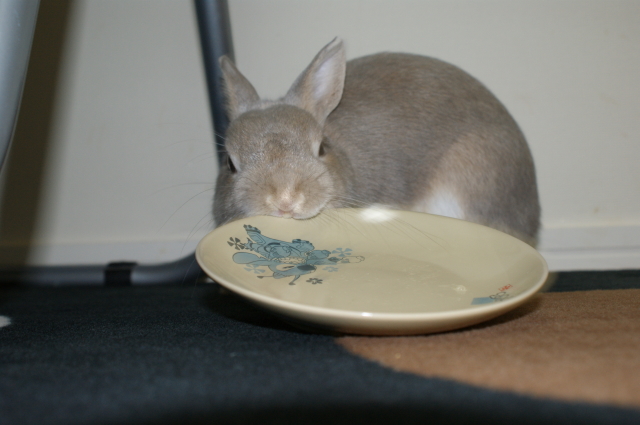 もっと食べたいとお皿をくわえて投げてアピール。